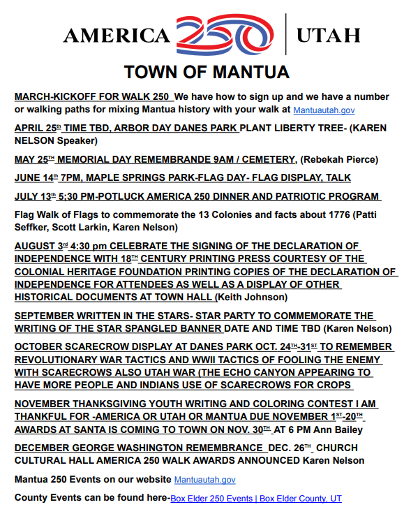 Walk250 Utah challenges every Utahn and everyone from Mantua to complete 250 Miles of outdoor exercise between now to December 31st to honor our nation’s 250th anniversary. While we say “walk”, you can bike, run, dance, play pickle ball, do yoga, etc. We have some conversion charts to help calculate your progress. There are also routes you can walk to discover Mantua. If you sign up, the state will track your progress through the end of July. For August 1- December 31, 2026, you keep track of your progress. We will have a completion certificate at the conclusion of the challenge, and all the names will be collected for a drawing. The REAL prize is doing this together. The power of Utah’s landscape offers a unique lend through which we can view the past, be jumping off points for adventure, and foster learning about what we call home. While celebrating the outdoors, Mantua can take time to examine our history. Here are some routes you can choose from. Take a picture of the route you are on!