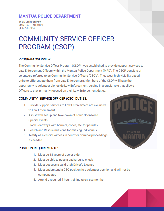 The Community Service Officer Program (CSOP) was established to provide support services to Law Enforcement Officers within the Mantua Police Department(MPD). The CSOP consists of volunteers referred to as Community Service Officers (CSO's). Register here: COMMUNITY SERVICE OFFICER APPLICATION