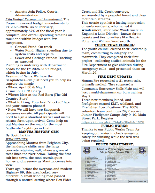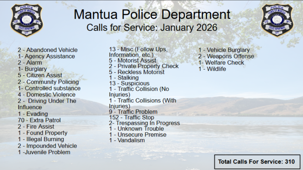 Mantua Reservoir State Park - A proposal is in the works to turn Mantua Reservoir into a state park. Resident feedback is crucial, watch for upcoming meetings and share your thoughts! Tours of Mantua Reservoir (Jan 30, 10 am) and Echo Reservoir (Feb 6, 10 am) are planned with the State Parks and city council. Stay tuned for more details on how you can get involved.
