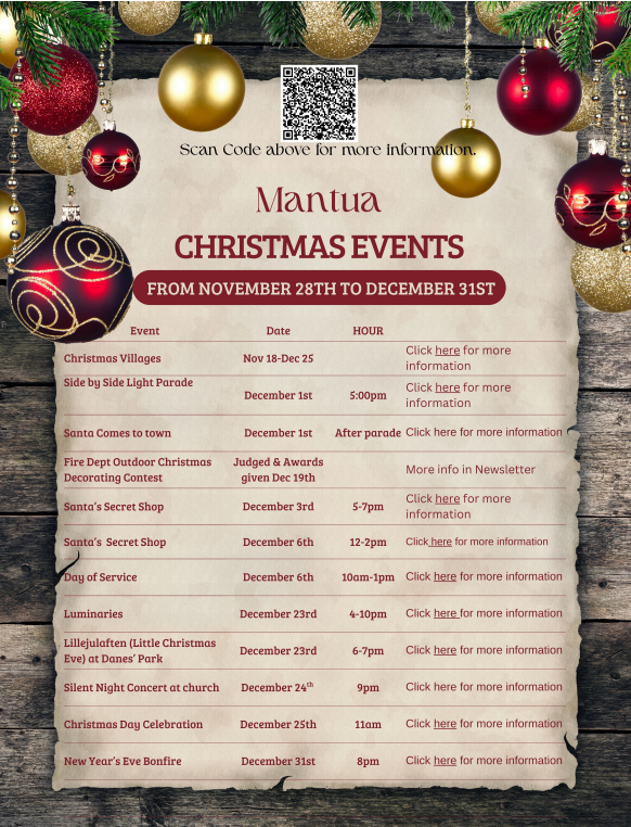 Thank you to all who helped with the Christmas Activities! The Christmas villages, Santa’s secret shop, Luminaries, and so much more. Santa and Mrs. Claus came to Mantua just to visit the children. Thank you for making this year Merry and Bright!