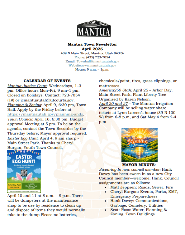 January 5, 2026 6:30 PM New Mayor and Council Member swearing in! In celebration of this special occasion, we’ll have a sweet treat table! If you would like to bring a favorite dessert, please email Sherita at sschaefer@mantuautah.gov by January 3, 2026. Come enjoy delicious desserts and meet Mantua’s Town Council!